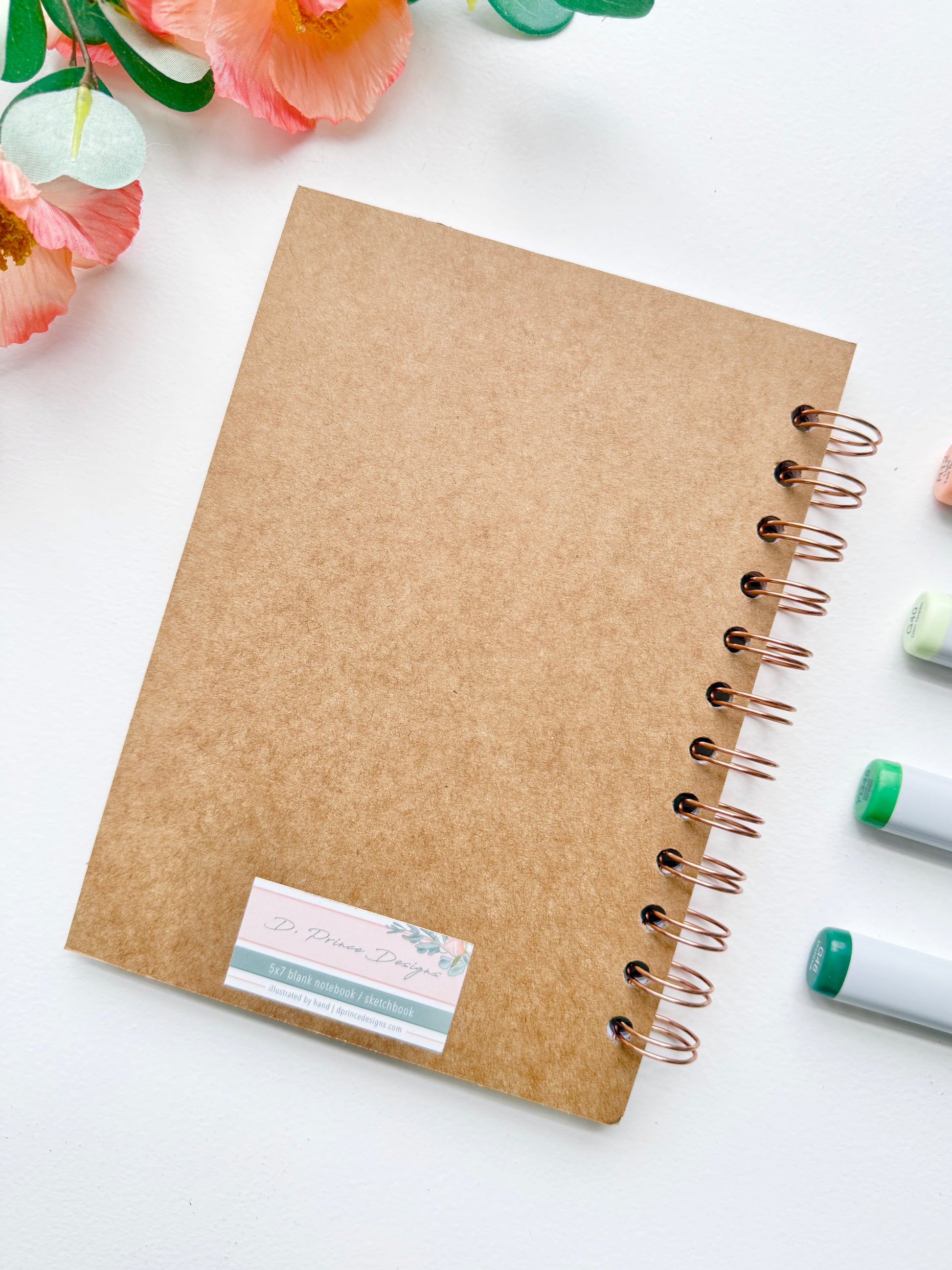 This 5" x 7" 70-page notebook/sketchbook features an D. Prince Designs illustration. Each notebook is assembled and bound by hand with high quality blank paper. Please note: the spiral binding color may differ from the photos shown depending on availability.